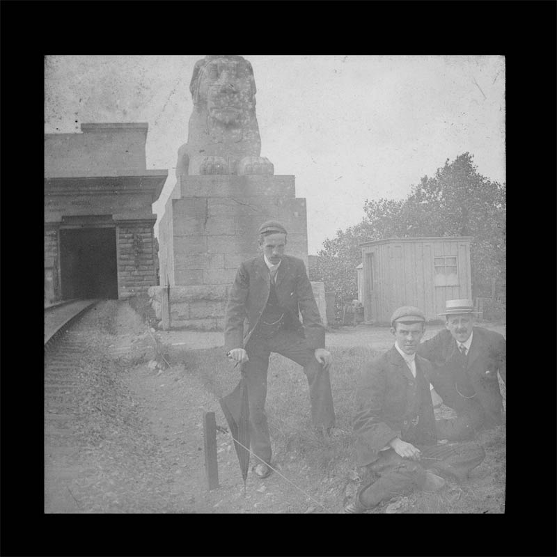 Description : Bangor entrance, Britannia Bridge, Menai Strait, North Wales (c.1905). The inscription, which is partly visible, reads "ERECTED ANNO DOMINI MDCCCL ROBERT STEPHENSON ENGINEER". Sadly, the beautiful stone lions carved by John Thomas are now sitting forlornly under the bridge's road deck.